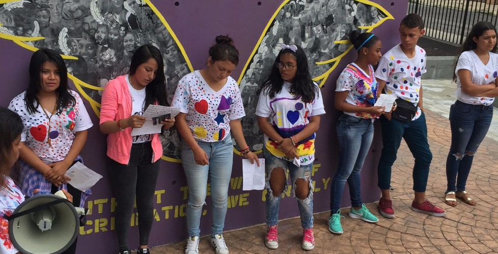 In collaboration with the Pan American International High School (PAIHS) in Elmhurst, Queens, ARTE students organized a community arts and human rights event on August 10, 2016. This mural project drew from personal experiences and passions, as well as the human rights topics they had explored in their year long in-class program. After engaging with the curriculum, which all highlighted the intersectional nature of inequality and persecution, students chose to focus on the fundamental idea that all human beings are equal and decided to use their mural to speak out against all forms of discrimination.